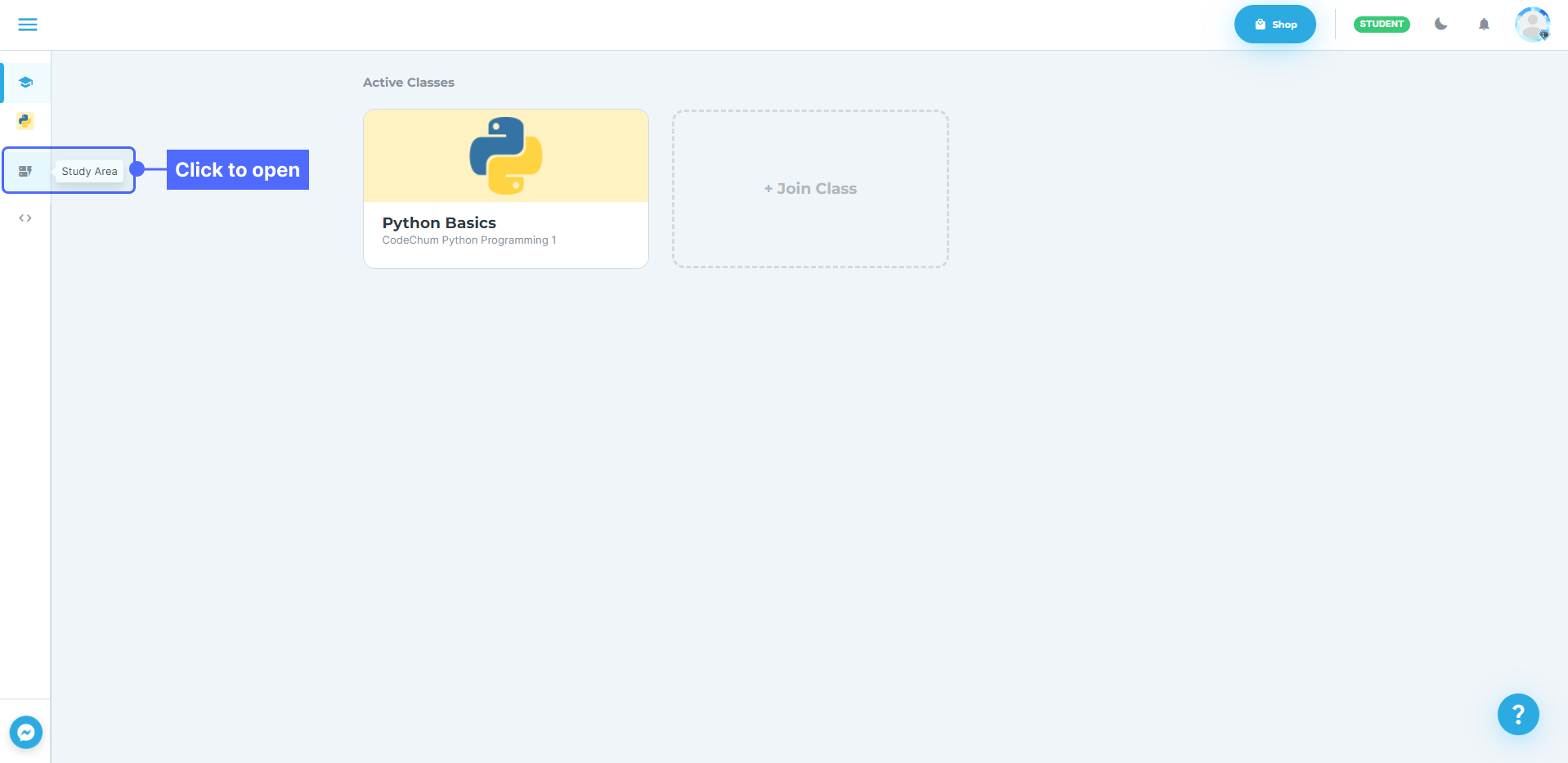 <figure><img src="https://3430199281-files.gitbook.io/~/files/v0/b/gitbook-x-prod.appspot.com/o/spaces%2Fd8NbYQ7MMXKmd7h0dJgN%2Fuploads%2FzrFssSR4SwtxrHMYwpI2%2F5.png?alt=media&#x26;token=7ee0d64f-304d-4666-862b-6c3bfdc32102" alt=""><figcaption><p>CodeChum Study Area interface</p></figcaption></figure>