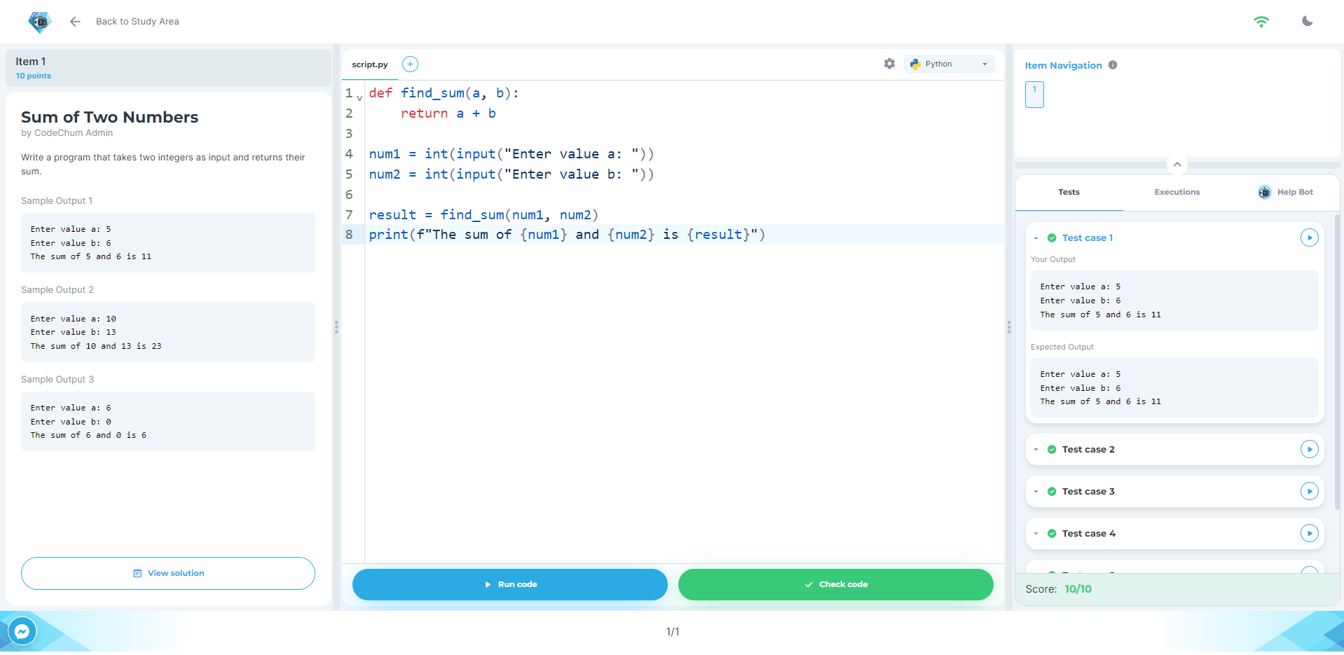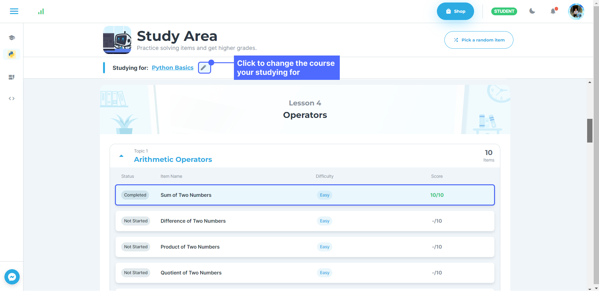 6. Once done answering, your score for that item will be reflected in the Study Area. Answer as many items as you can and learn programming at your own pace!&#x20;