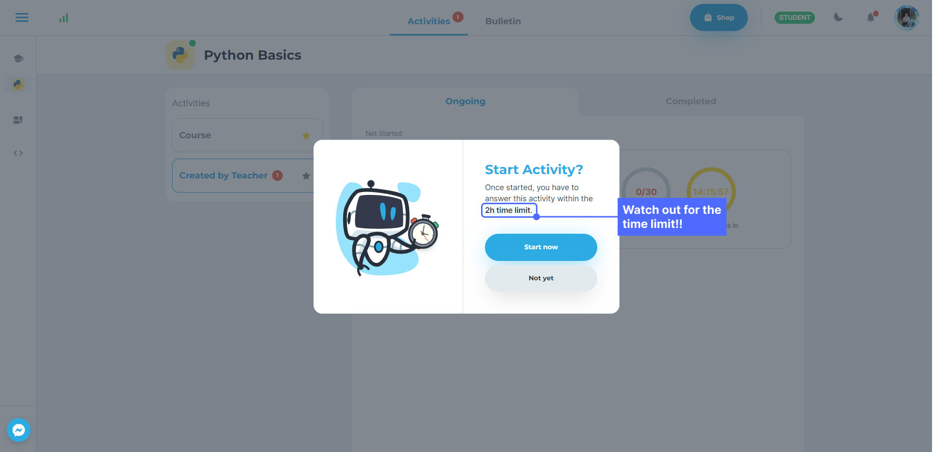 2. Click on the activity card to start answering the activity. If the activity has a set time limit, be mindful of the time as you can only answer the activity within that duration once you start it.