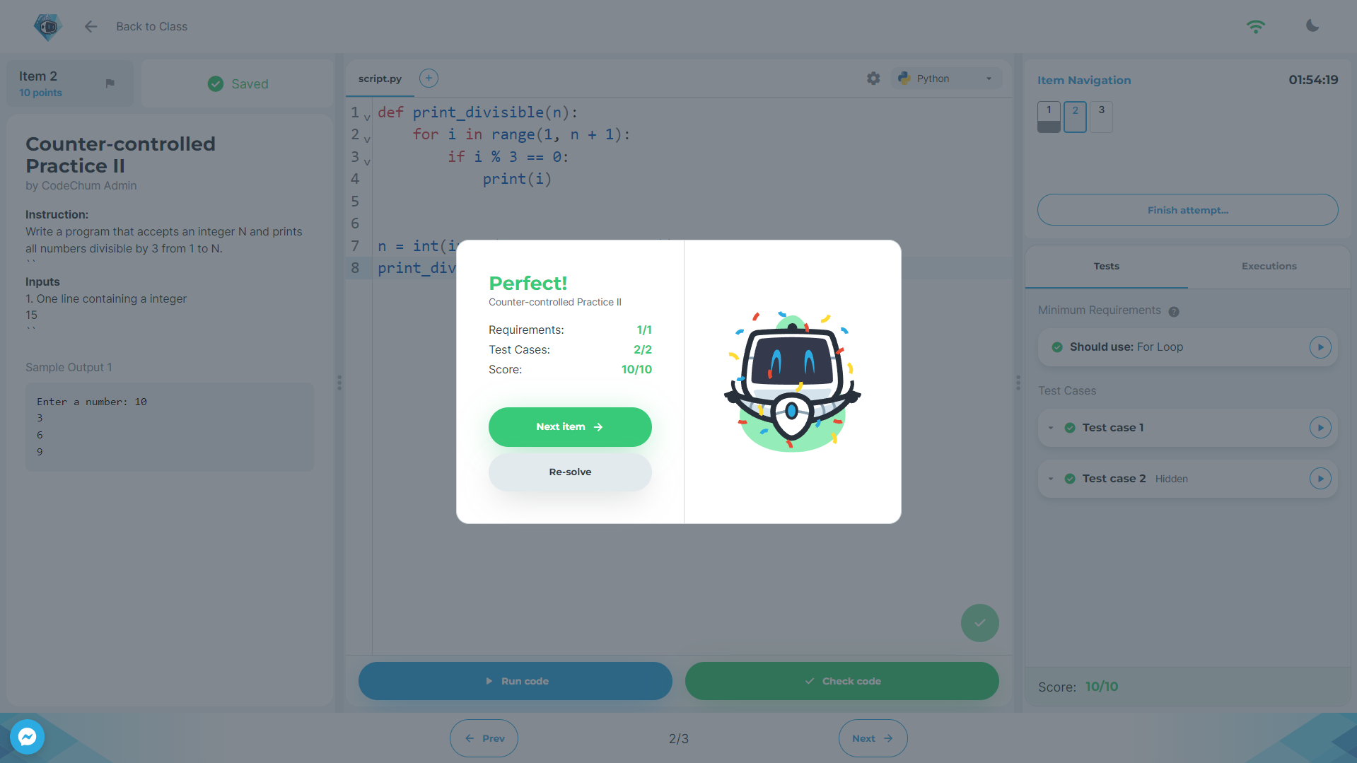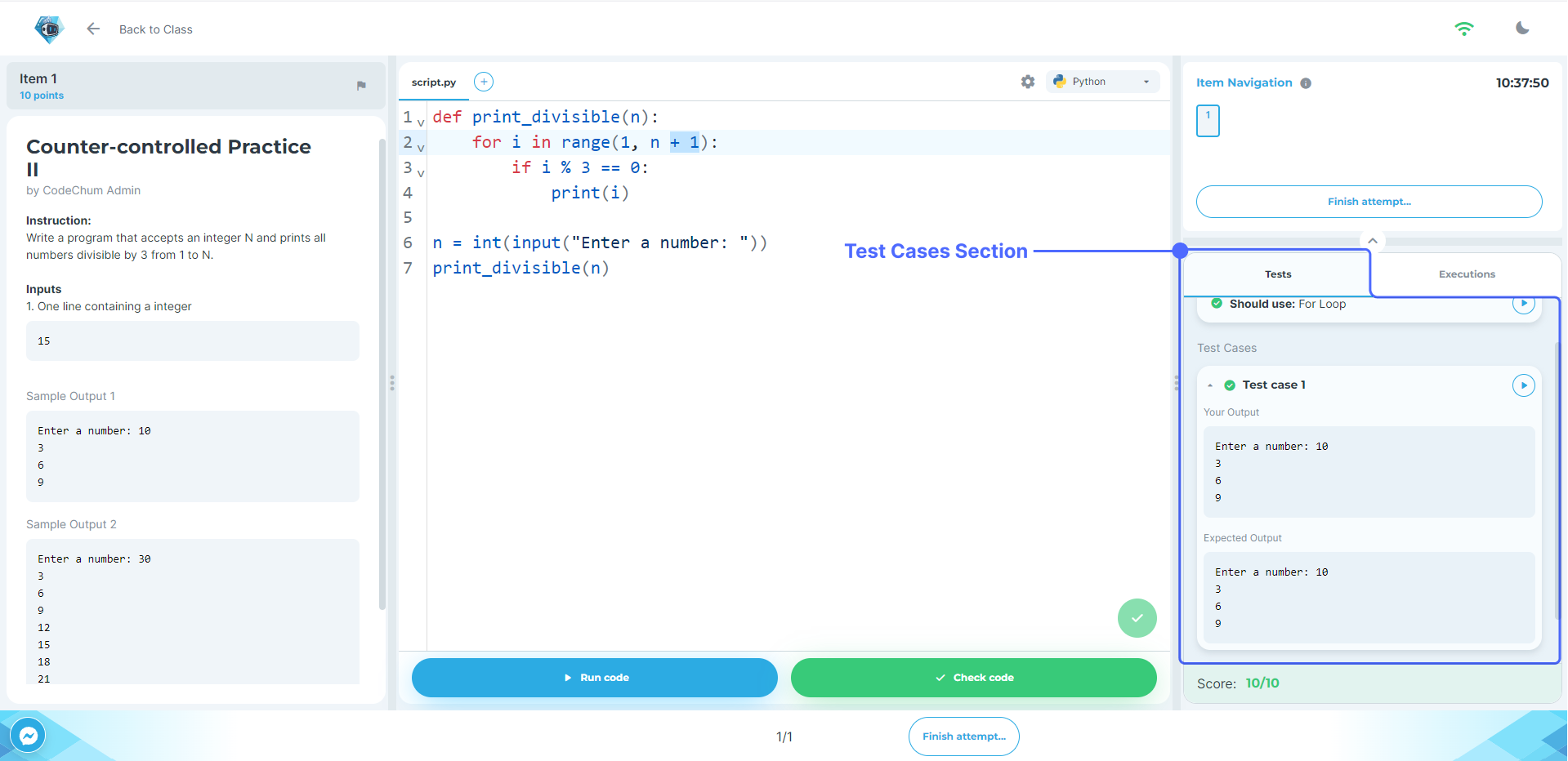 3. Answer all items by coding your way out of it and check your code if it's correct in comparison to the test cases by clicking the **Check Tests** button. Doing this will show a popup window with your score in it.