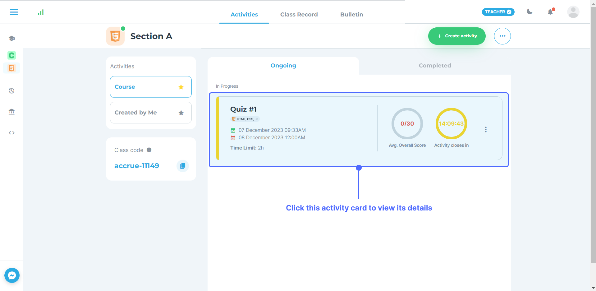Go to your class' Activities tab and click on the activity card you wish to export. This will open a popup window showing the activity details and more.