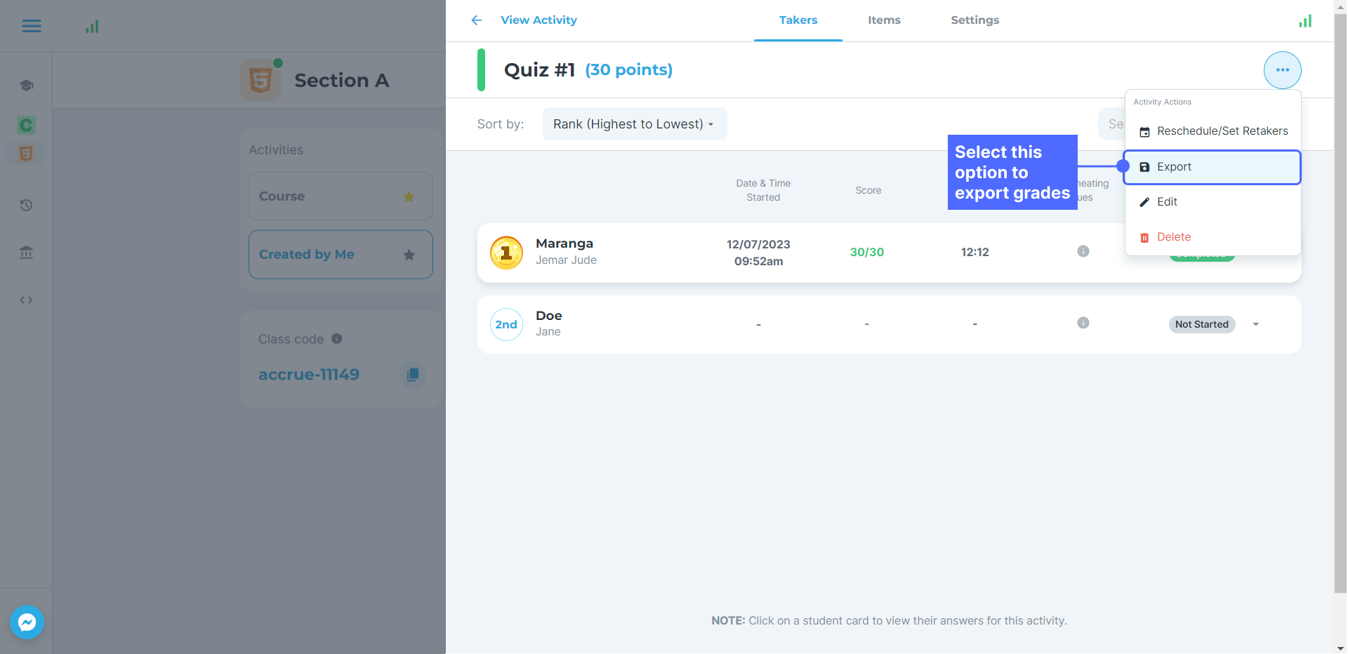 In CodeChum, there are two ways to export your grades in a class: for a specific activity, or for the entire class.